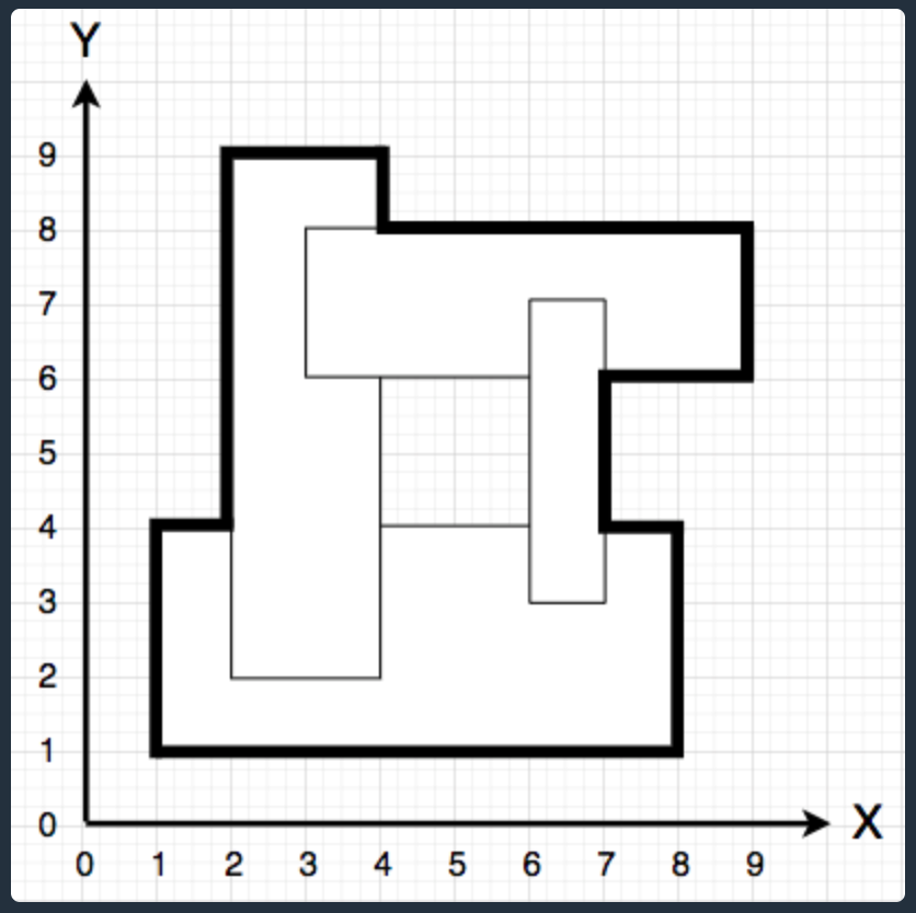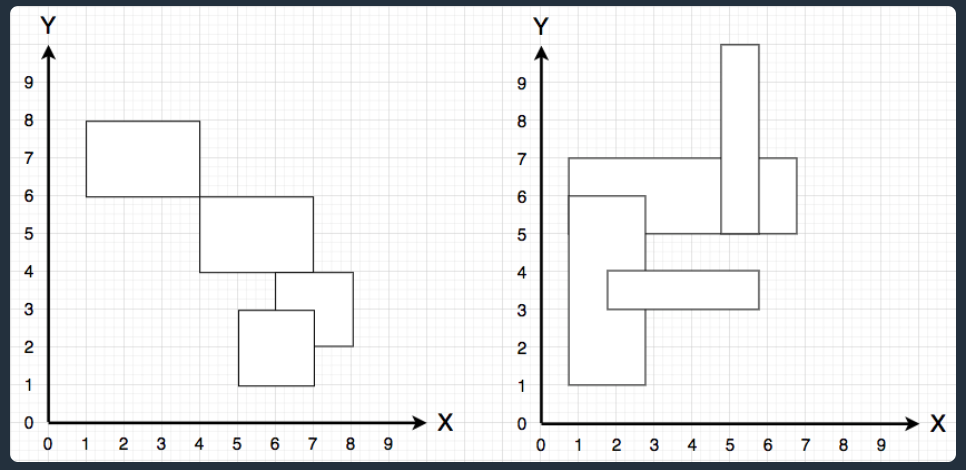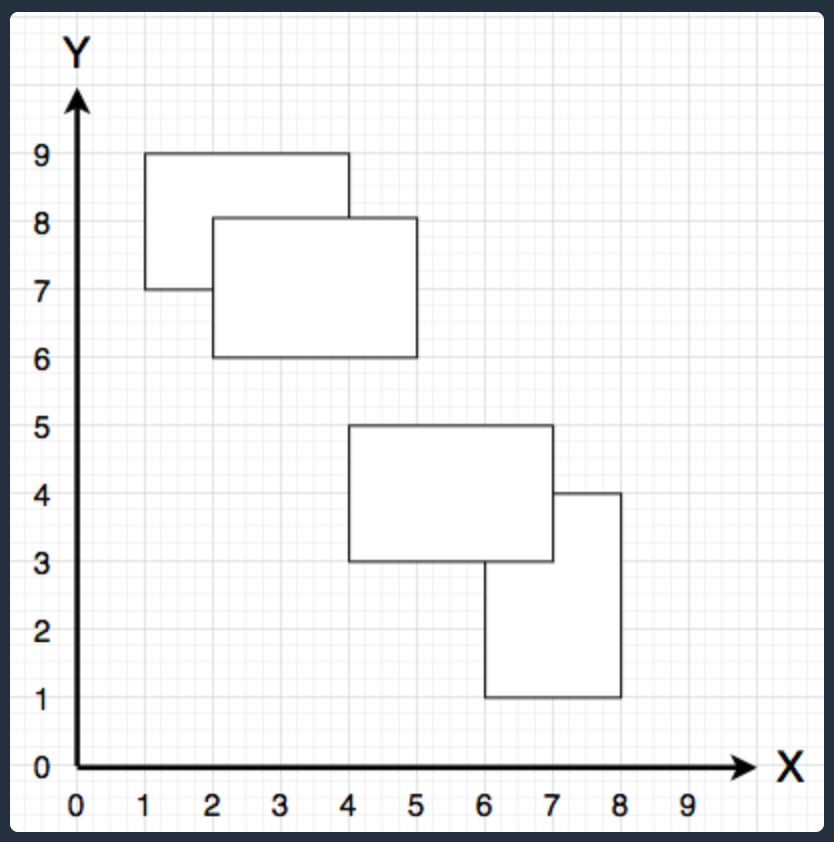 - 서로 다른 두 직사각형의 x축 좌표, 혹은 y축 좌표가 같은 경우는 없음