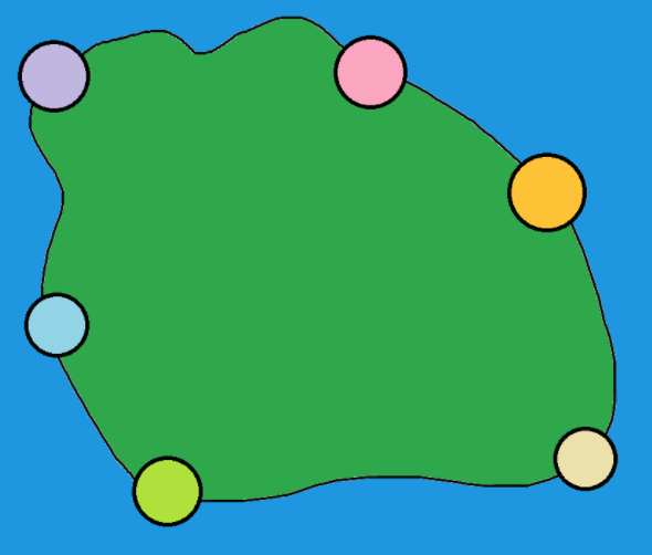 - 임의의 A마을에서 임의의 B마을로 가기 위해서는 왼쪽 또는 오른쪽 도로를 통해 해안가를 따라 섬을 돌아야 함